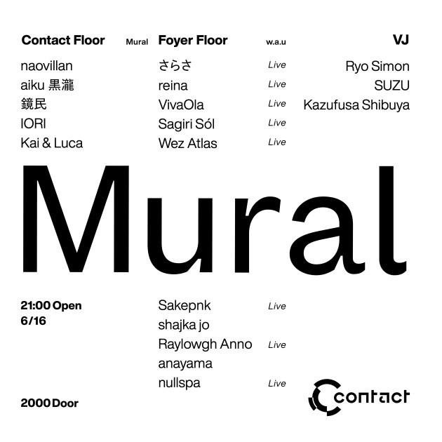 新鋭のアーティストや芸術家との共創により、新たな文化を構築し、独自のコミュニティ形成に焦点を当てるMuralが3ヶ月ぶりにパーティを開催。ContactフロアはGALAXYのIORIに加え、様々なフィールドにて独自のアウトプットで音楽表現の幅を広げるDJ陣が登場。Foyerはw.a.uのオーガナイズにより、さらさやVivaola、Sagiri SólにWez Atlasといった熱がこもりながらも落ち着いたサウンドに心酔する夢のラインナップが実現。二つのフロアから鳴り響く不協和な音の豊かさを嗜みながら、個のエネルギーがぶつかる独特なコミュニティをこのSessionにて体感してほしい。