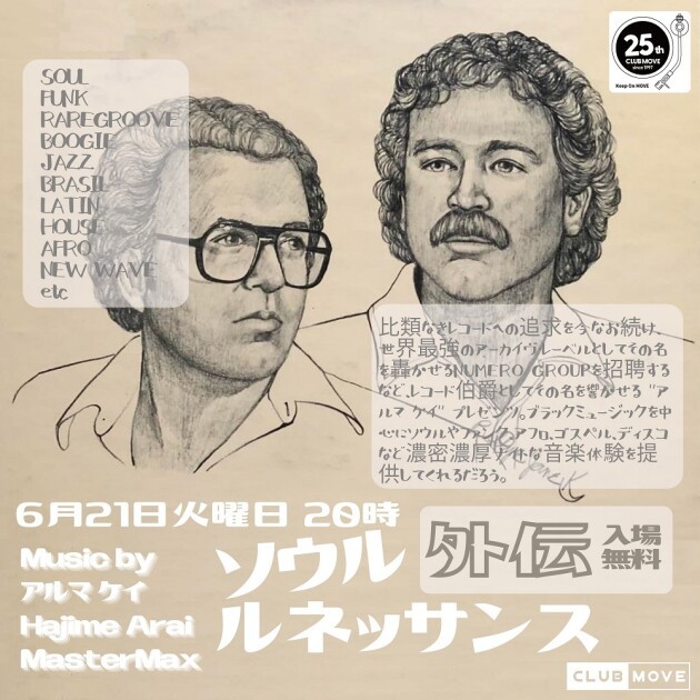 比類なきレコードへの追求を今なお続け、世界最強のアーカイヴ・レーベルとしてその名を轟かせるNUMERO GROUPを招聘するなど、レコード伯爵としてその名を響かせる "アルマ ケイ" プレゼンツ。ブラックミュージックを中心にソウルやファンク、アフロ、ゴスペル、ディスコなど濃密濃厚ナイトな音楽体験を提供してくれるだろう。