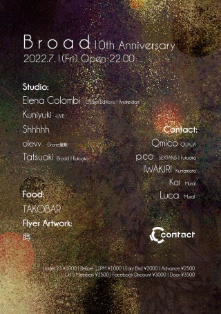 Broad, the party organized by Tatsuoki who moved his base to Fukuoka in Kyushu from Tokyo in 2020, celebrates its 10th anniversary. In 2012, Broad started from zero at Daikanyama AIR on Tuesdays focusing on paying close attention to originality and exploring cutting-edge sounds. The party, currently contributing to the scene in both Fukuoka and Tokyo, moved to Contact Tokyo in 2016 to host on a regular basis. With the closing of the venue this coming Autumn, this will be its last celebration to be held at this location.