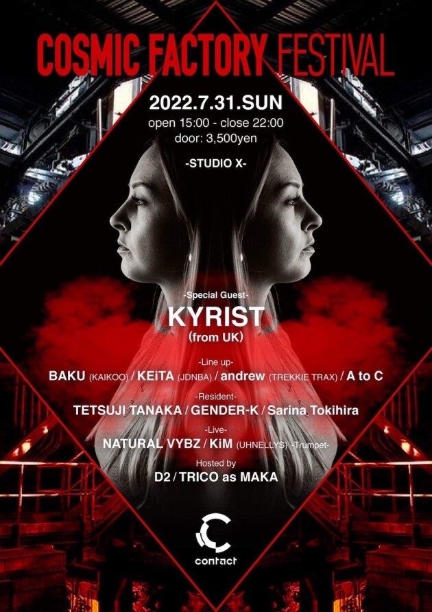 東京-沖縄を繋ぐ数々のビッグパーティをプロデュースしてきたTETSUJI TANAKAとGENDER-KのCOSMIC FACTORYがContact・ファイナルに伴い、7/31(日)Contactでのラストパーティを主催する。開催の度に満員のオーディエンスを熱狂へと導いてきたコズミックファクトリー最終章にコロナ禍以降初の来日ドラムンベース・アーティストKYRISTを招聘して豪華ラインナップで開催!全フロアUKサウンドをコンセプトに室内フェスティバル規模のドラムンベース x ベースミュージックのクオリティーな側面をフォーカスした贅沢な空間を演出する。