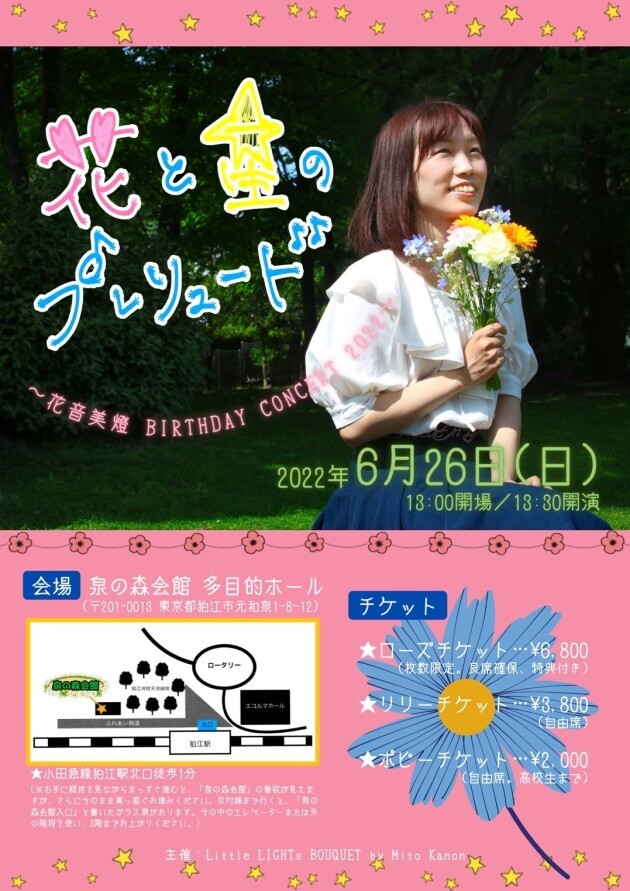 ミュージカル女優・アーティストとして活動を続ける花音美燈のバースデーライブ! 生まれ育った町に立ち返り、緑を感じながら、新たな風を巻き起こすーー!? ミュージカル曲・ポップスカバー・オリジナル曲・・・様々な楽曲を織り交ぜてお届けいたします★ 朗読×歌のステージも見どころ!