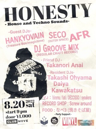 今回は "真夏のハウス祭" としてGUEST DJに関西アンダーグラウンドのハウスシーンを担うDJ HANKYOこと "HANKYOVAIN" 、関西のミュージックラバー達が集う数々の夜を牽引し続ける "SECO" と "AFR" 、