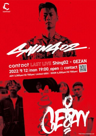 Shing02 and GEZAN share the stage with only 5 days left until Contact closes its doors for good. The one and only Shing02 returns to Japan for the first time in close to 3 years. Sharing the stage is the revolutionary GEZAN, the band that has dramatically changed the local scene.
