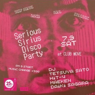 MOVE界隈の様々なDJ達によるミュージックセッション。 この日は京都よりHit-4と神戸よりmaeken、滋賀からDaiki Sagaraが参加。 7/9(土) Serious Sirius Disco Party (DEEP HOUSE,DISCO,SOUL,BALEARIC etc) PM 9 START MUSIC CHARGE¥500 MUSIC by Tetsuya Sato (Round) / Hit-4 / maeken / Daiki Sagara
