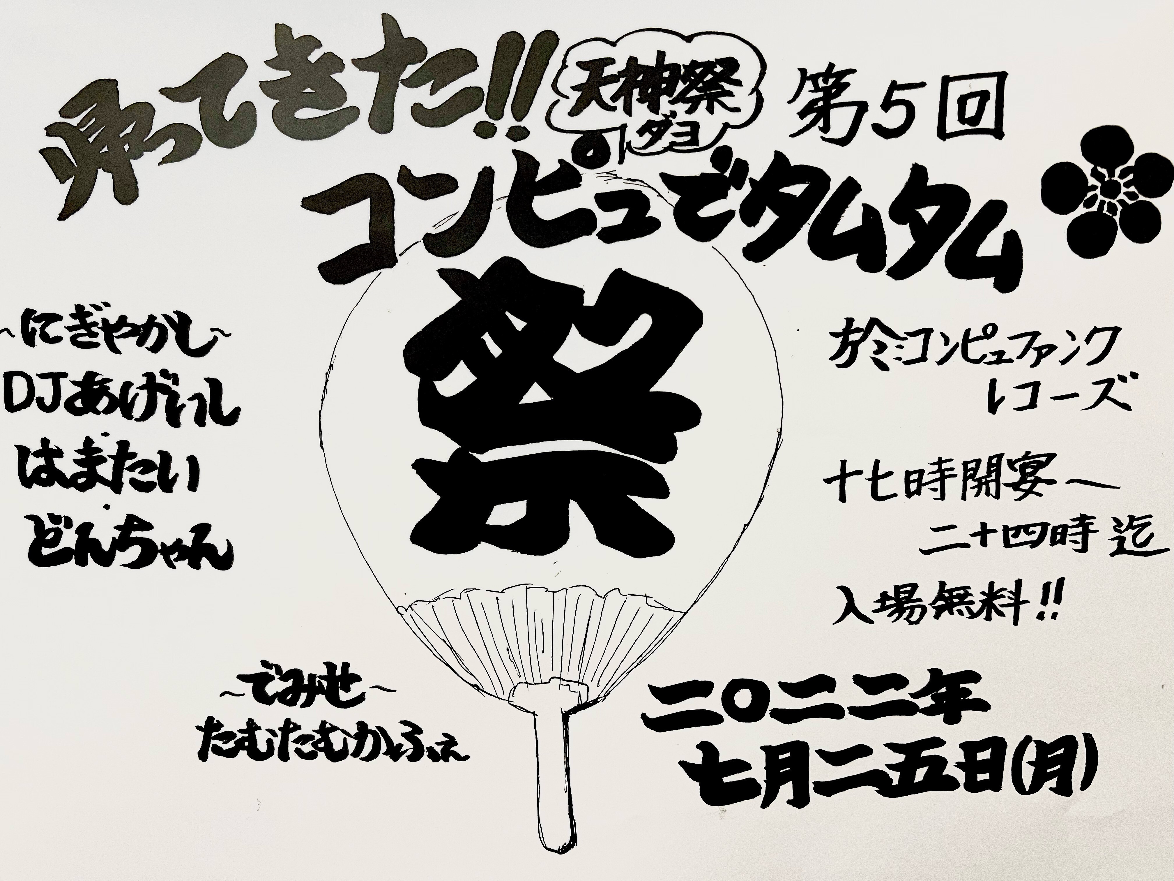 2年振りに開催!年に1度のレミちゃんオーガナイズ☆7月25日月曜に北浜Compufunk Recordsにて5回目の『天神祭ダヨ!コンピュdeタムタム』で出店します♫いつもと違うお祭りメニューで花火は無くとも夏祭り!豪華DJ出演で入場無料なのでぜひ◎