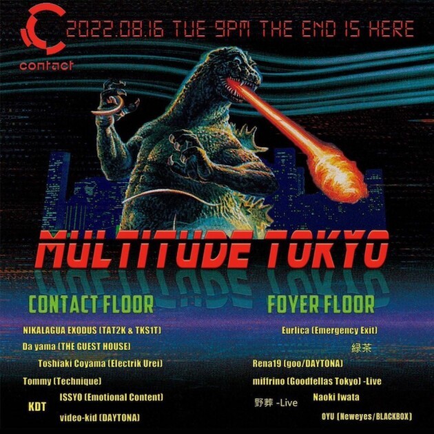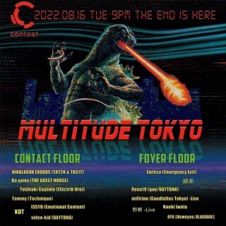 CONTACTフロアではMULTITUDE TOKYOの前身、ギミギミ!を主催したKDTが磨きに磨いたディスコ、ハウスをプレイ。そしてKDTの傍で研鑽を重ねたISSYOが珠玉の変態サウンドを重ねる。