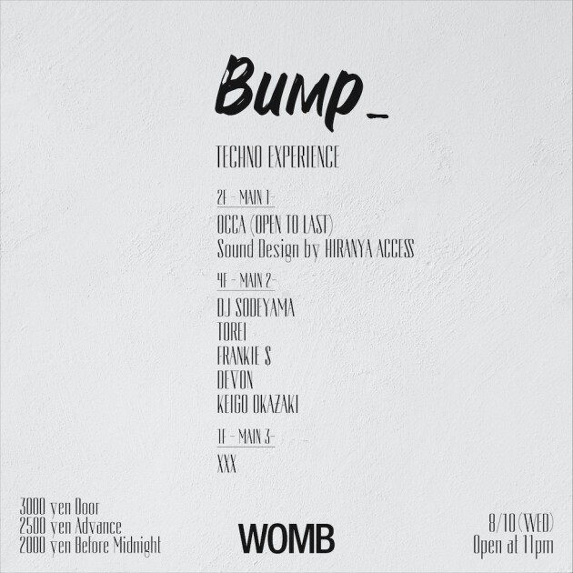 8月10日(水) Bump_TECHNO EXPERIENCE を開催!2F の Main 1は、札幌を拠点に活動し、数々のトップアーティストから高い評価を受け、またここ最近の全国のパーティー、フェスでの活躍でも注目を集める OCCA の Open to Last!