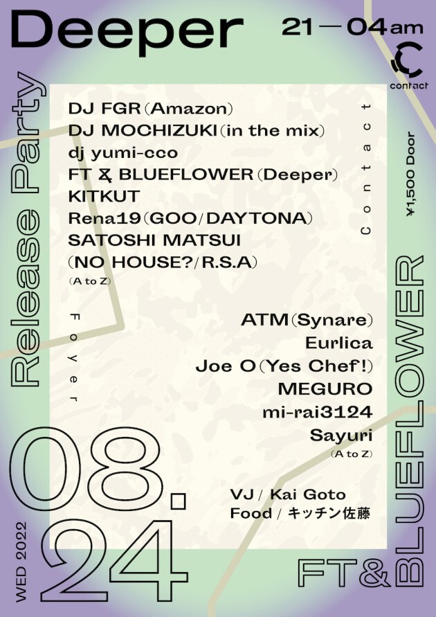 FT, a DJ/Producer active since the 90s who has contributed remixes for UnitedFutureOrganization, Tokyo Ska Paradise Orchestra, and released a number of tracks on labels such as Dazzle T's imprint ZeroThree. BLUEFLOWER, having experienced the dawn of the club culture, has been organizing and DJing at countless parties. In recent years, FT & BLUEFLOWER joined forces to start their own party 'Deeper' at Aoyama Zero and began sound production. In August of 2022, they released their 1st single as FT & BLUEFLOWER. This edition invites veterans and up-and-coming DJs/Producers in the underground scene that are closely affiliated with the two as guests for their release party.
