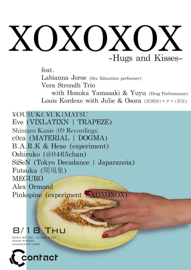 強い芳香と蜜を出す完熟した8月の熱帯夜、フェティシズムとテクノの臨界が交わるポイントXOXOXOXがContactでの終幕を迎える。ラバー、レザー、SM、ゴシック、ロリータ、サイバー、ボディアートといった世界の裏面と、アンダーグラウンドテクノの最深部がつながる。