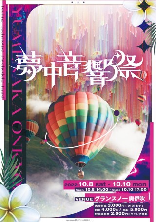 夢中(ゆめなか)音響祭とは… 都会の喧騒を忘れて山に囲まれた草原での2泊3日野外音楽フェス。 デコレーションされた会場で最高のアーティストとサウンドシステムから響き渡る音とともに、まるで夢の中の出来事の様なひとときをお楽しみください。