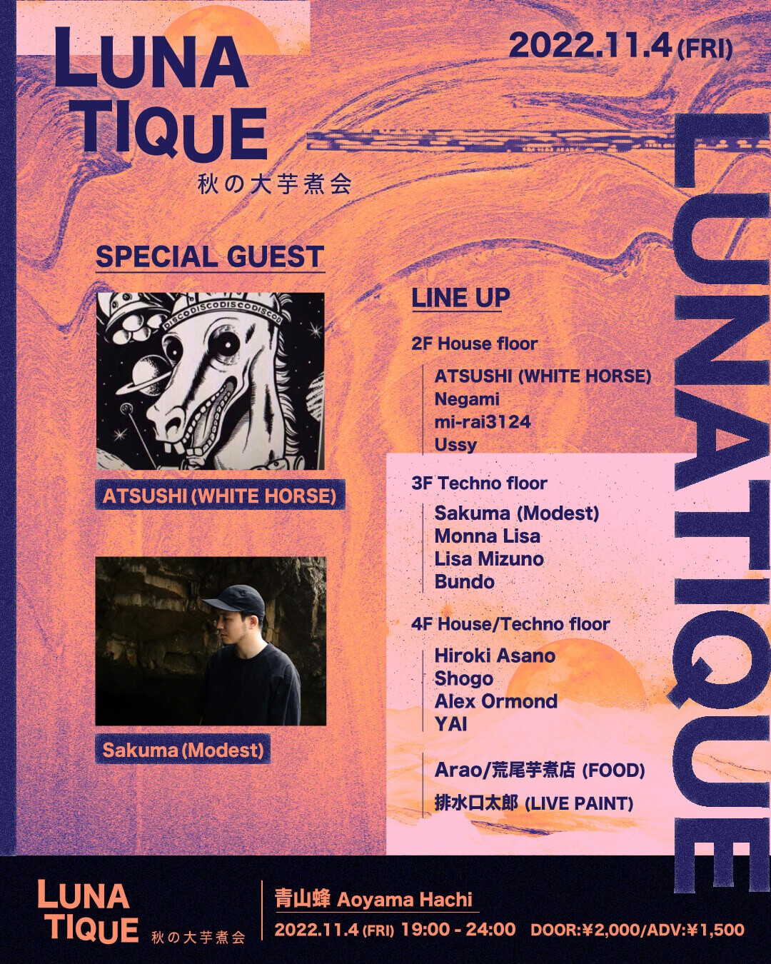 青山蜂で平日に不定期開催しているHouse/Techno Party『LUNATIQUE』は、11/4金曜の夜に3フロアを解放し、満を持して特別版として開催!Special Guestとして、東北各地でHouse DJとして活躍し、鶴岡市の良箱TITTY TWISTERで人気Party『WHITE HORSE』を主催するATSUSHIと、説明不要のTechno Party『Modest』を主催し、都内のクラブから野外フェスに至るまで精力的に活躍しているTechno DJ Sakumaを招致。他、2階ではフード出店としてオーガナイザー Araoが東北の秋の風物詩『芋煮』を創作。極限まで現地「みちのく」の味を再現し提供する。また、4階では今旬の個性派アーティスト・排水口太郎(SinkHole Man)によるサイケデリックLIVEPAINTも披露!個性派のDJとその他パフォーマンスにより、秋の週末の蜂を彩り満載のPartyで飾る。