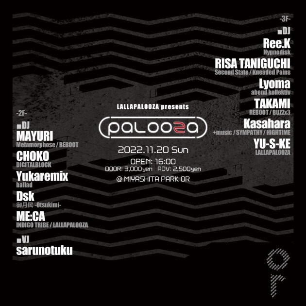 都市型テクノフェス『LALLAPALOOZA』のサテライトパーティー『PALOOZA』が渋谷のランドマークMIYASHITA PARKにて展開するOR TOKYOにて開催!Ree.K、MAYURI、RISA TANIGUCHIなどが登場!
