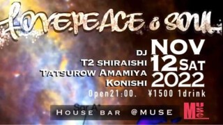 HOUSE BAR MUSEが誇る毎月第二土曜日開催のLOVE,PEACE&SOUL通称ラブピー、日本が誇るHOUSE DJ 天宮辰郎(ECSTASY BOYS)、キングオブディスコKONISHI、唯一無二な世界を音の力で創り出すT2 SHIRAISHI(白石徹也) 3〜40年のDJ キャリアを持つ彼ら。互いのその日のプレイを密かに意識し合い、水面下でドヤッるプレイ。その選曲はその日、その時、その刹那しか生まれないものである。(まぁぶっちゃけオジサン達がキャッキャいいながら渋いDJ交代でやってるだけなんだけどネ!)そんな店主もちょい緊張しながら開催されるラブピーです。