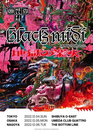 圧巻の演奏スキルと爆発的イマジネーションで新世代UKロック・シーンの中でも突出した存在感を放つカリスマ・バンド、ブラック・ミディ。衝撃の2ndアルバム『Cavalcade』から1年、早くも最新アルバム『Hellfire』を7/15にリリース。昨年延期になったジャパンツアーの振替公演の新日程も決り、そしていよいよ前売チケットが再販売開始!