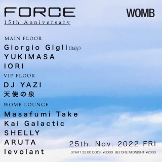 世代や時代、次元を超越する電子音楽の探求を続けてきた FORCE。11月25日金曜日に、日本を代表するベニュー WOMB にて15周年祭を開催する。MAIN FLOOR には、Donato Dozzy や Freddy K と並ぶイタリア・ローマのリビングレジェンド Giorgio Gigli が来日。彼の幅広いプレイスタイルはテクノに造詣が深いフリークスのみならず、来場した全てのオーディエンスにダンスミュージックが本来持つ素晴らしさや楽しさを提供する。サイケデリックなアプローチや、時にはハウシーな瞬間さえも盛り込まれた唯一無二のヴァイナルセットを体感して欲しい。