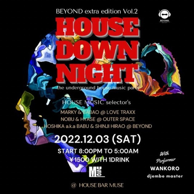 2022年最後の BEYONDは前回ゴールデンウィークスペシャルとして5月に開催し好評だった HOUSE DOWN NIGHTで締めくくります。前回と同じくDJ陣も関西を中心に活躍中の