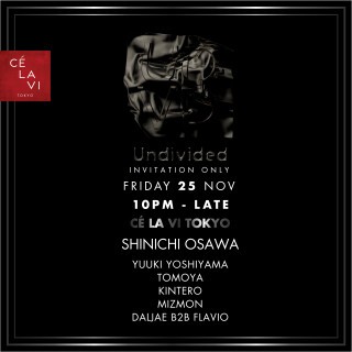ドバイ、シンガポールなど、Celaviの各グローバル展開の中でも House Techno といった4Beats の音が主流になる中で、ここTokyoでも本格的な「Underground Exclusive」を体現させるべくスタートするイベント「Undivided」。記念すべき第一回目の開催には、現在の日本のクラブシーンを代表する DJ/アーティストたちが集結して上質な空間を作り上げ、「Undivided」の門出を祝福する。
