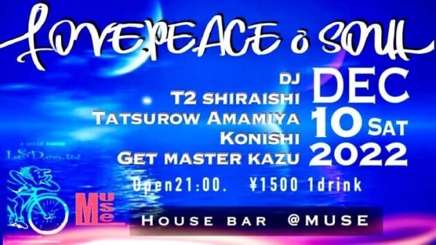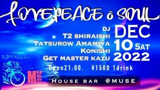 キックの音で軽く震えてるドアを引くとミラーボールに弾かれた光、音量の中、声を張って交わされるくだらない談笑、テキーラの匂いタバコの煙。DJがかける曲を心の中で向き合って自分自身でテンションを整える、いいよねぇ、ハウスミュージック!毎月、第2土曜日恒例のLOVE,PEACE&SOUL、通称ラブピー、今回10月はディスコキングKONISIがお休み。 天宮辰郎(ECSTASY BOYS)の新旧織り交ぜたHOUSE MUSICメインの選曲とMIX、T2 SHIRAISHI (白石徹也)が醸し出し予測不可能テツワールド、DEEPHOUSEメインながら、 DANCE CLASSICの名曲を差し込んでくるGET MASTAR KAZU、マイペースを装いながら、3名が互いを刺激し合い程よい緊張感のあるプレイはやはりベテラン3人が集まるからこそオーディエンスが体感出来る世界だと。 毎月第2土曜日、ラブピーをHOUSE BAR MUSEにて。
