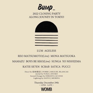 最高な音と人との出会いを求め世界中の PARTY やフェスを旅する Bump_ 。そんな NEXT LEVEL の本物のパーティー Bump_ の2022年クロージングパーティーを、WOMB 全フロアを使って12月29日に開催。