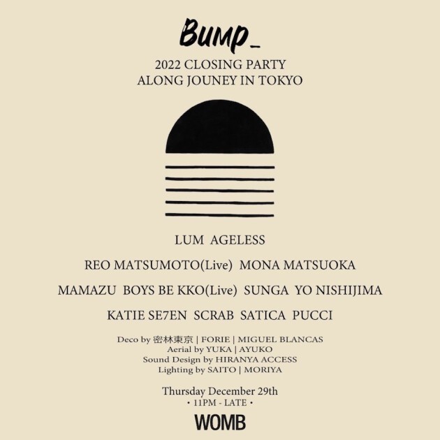 毎回、参加してくれる全ての方を魅了しながら成長を遂げた Bump_ の2022年クロージングパーティーのスペシャルゲスト達は、Mexico Tulum 在住でスローハウスの人気を博す Lum!!! そして今年の夏イビザ島で最も旬な人気若手の Ageless!!!そして NY で DJ やモデルとしても活躍中の Mona Matsuoka!!!そんなお祝いムードな年末の Bump_、日本人勢も超豪華!