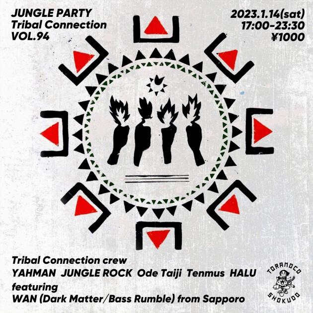 2009年に始動のジャングル・パーティー。Reggae/Dubの力強さ、脈々と現代に繋がっているSoundsystem Cultureの重低音、Raggaの激熱咆哮と存在感、Jazz/Soul/Funk/Hiphopなどの刻みに即興感、HouseやTechnoの反復の快楽、Raveの天井知らずの高揚感、心躍る各地のメロディにリズム、生~電子楽器など、様々な音の要素を吸収しそれらを疾走感あふれるブレイクビーツと重低音に乗せて一気に放ち音の密林へ誘う血湧き肉躍る雑食ダンスミュージック=JUNGLEを中心に、黄金のBass CultureとRave Cultureを結びつけ、熱い音を楽しめるパーティー、それがTribal Connection。