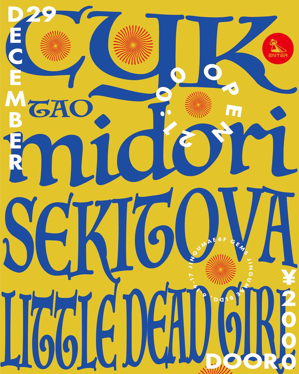 初回は、年末スペシャルとしてTAOのContact最後の開催にも出演してくれたCYK、大阪ら東京に拠点を移し益々活躍の場を増やすSEKITOVA、DJやプロデューサーとして活動しているLittle Dead Girl、ロックバンドthe hatchのボーカルMidoriが登場!