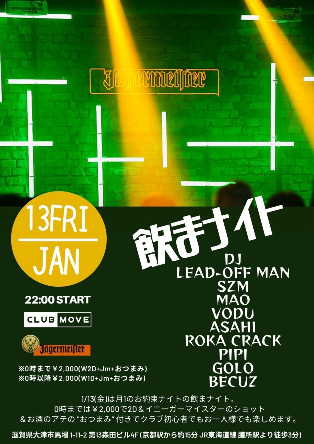 1/13(金)は月1のお約束ナイトの飲まナイト。0時までは¥2,000で2D&イエーガーマイスターのショット&お酒のアテの "おつまみ" 付きでクラブ初心者でもお一人様でも楽しめます。