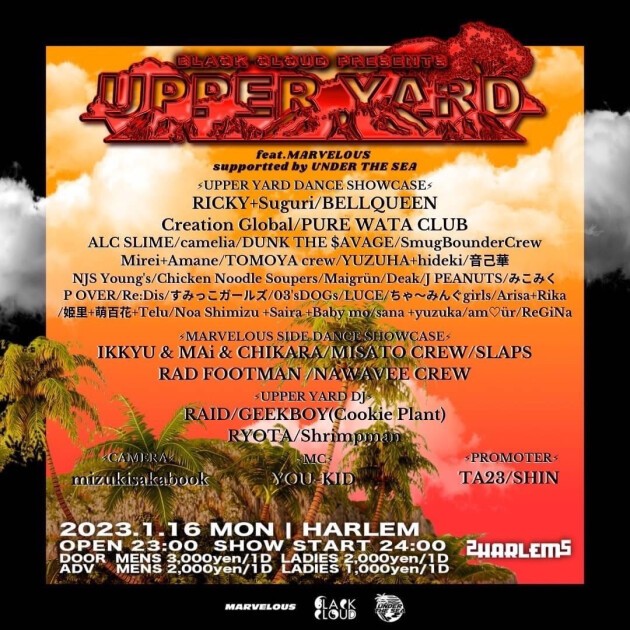 UPPER YARD DANCE SHOWCASE: RICKY+Suguri, BELLQUEEN, camelia, SmugBounderCrew, ALC SLIME, NJS Young’s, DUNK THE $AVAGE, TOMOYA crew, Mirei+Amane, YUZUHA+hideki, 音己華, Maigrün, Deak, J PEANUTS, みこみく, P OVER, Re:Dis, すみっこガールズ, 03'sDOGs, LUCE, ちゃ〜みんぐgirls, Arisa+Rika, 姫里+萌百花+Telu, Noa Shimizu +Saira +Baby mo