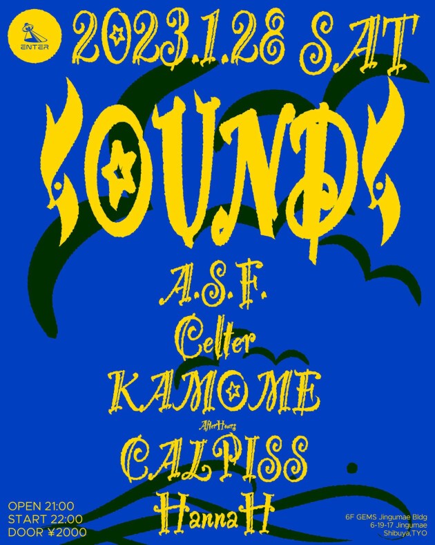 毎週土曜日のSOUNDSに、四人全員が1999年生まれであり、若さ溢れるグルーヴは世代問わず感度の高い音楽ファンの間で人気を集めているVinyl YouthよりKAMOMEが月1レギュラーで参戦。初回には道玄坂の翠月で毎月若者を虜にしているパーティーALIEN SEX FRIENDSより、P-YANとRYOKEIがA.S.F.として、最近ELLA WAREHOUSEやIC1813で注目を集めているCelterの3名を迎えての開催。3組のグルーヴのあるプレイに踊り狂え。