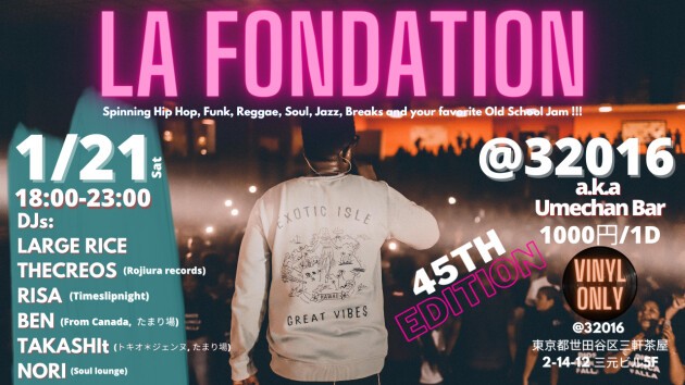 LA FONDATION Crew is proud to present our party's 45th edition. Our Djs will rock the place for an unforgettable event full of those old school joints !! For our first event of 2023 let's set Sangenjaya on fire !!!
