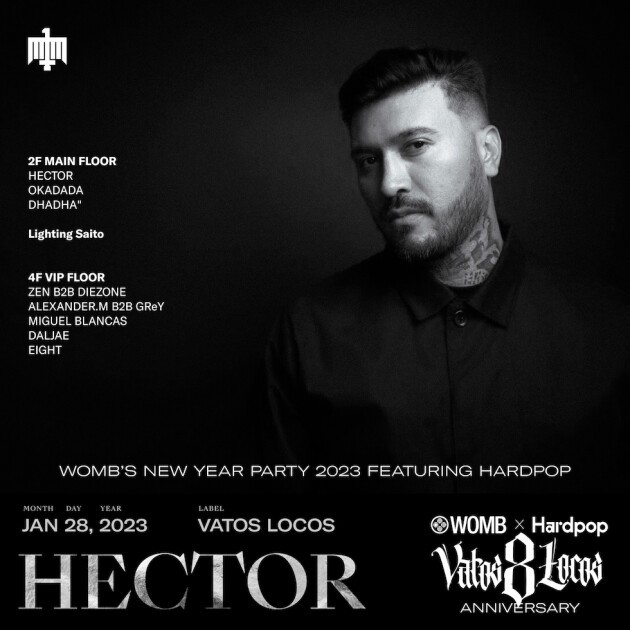 HECTOR の信念は DJ や音楽制作のみに留まらず、新人プロデューサーの発掘・育成、そして自身のレーベルでありイベントプロジェクト Vatos Locos の活動に精力を注いでいる。2016年に BPM Festival にてローンチした Vatos Locos は今年で8周年となり、メキシコと世界を繋ぐ橋渡し役として Hardpop と WOMB のコラボイベントを今回開催する。