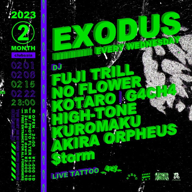 FUJI TRILLをはじめ多方面に活躍するDJ,BeatMakerが毎週水曜渋谷の夜をにぎわす通称" #エクソ "。LIVE TATTOO、PAINTも隔週でcheck。更に2月22日は祝前日開催ということで"EXODUS SPECIAL"の開催も決定。そして2月から外国からのお客様は入場フリー!!是非お越しください!!