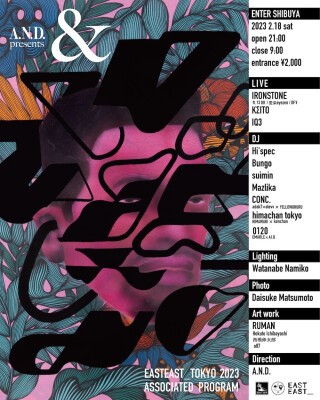 EASTEAST_ 主催の新たなアートイベント「EASTEAST_TOKYO 2023」の開催に合わせ、渋谷のENTERで音楽とアートが融合するパーティが開催される。2022年に惜しまれながら幕を閉じた半蔵門ANAGRAの店主でありDJのAI.Uが主体となり活動するアート集団"A.N.D."が音楽とアートが融合する一晩をメイクする。