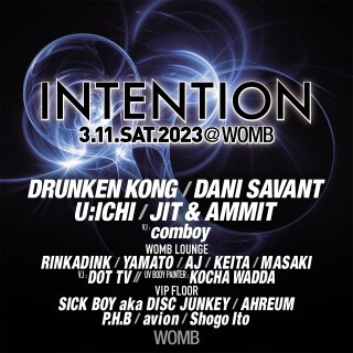 WOMB LOUNGE には、世界的に名を広げ、多くのファンを持つ RINKADINK が INTENTION に初出演!今回のセットも期待される。また Libero の TOP であり DJ そしてオーガナイザーで活躍している YAMATO。アメリカのテキサス州生まれで、ageHa のメインや OZORA でプレイをし経験を積んでいる AJ。