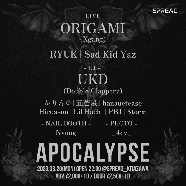 SPREADでLil Hachiが主催するパーティー。第2回となる3月20日は、Xgang(クロスジヒトリ)のメンバーとしてトラップメタル、フォンクの要素を取り入れたスタイルで活躍するORIGAMI, Abema TV "ラップスタア誕生"で「ギンギンでGO」という個性溢れるフレーズで話題沸騰中のRYUK, 今年1月に『Tokyo R!ot』をリリースした東京の"悲劇的少年"Sad Kid Yazがライブゲストとして参加。