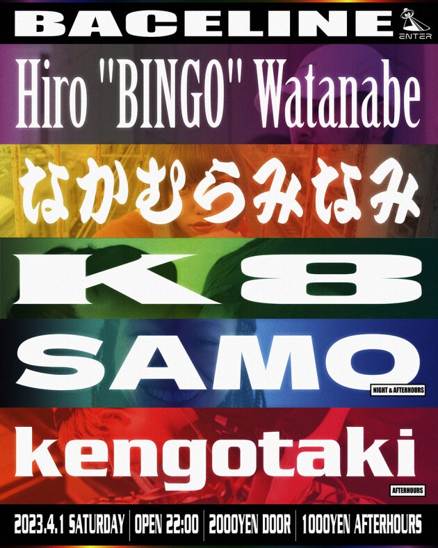 Enterになかむらみなみが初登場!エネルギッシュなMCと共に、Hiro "BINGO" WatanabeやK8、SAMO、kengotakiとジャンルに囚われないオルタナティブなDJ陣が出演する。ヒップホップとハウスのクロスオーバーによる化学反応は必見。