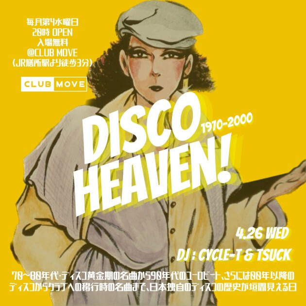 70~80年代・ディスコ黄金期の名曲から90年代のユーロビート、さらには00年以降のディスコからクラブへの移行時の名曲まで、日本独自のディスコの歴史が垣間見える日。