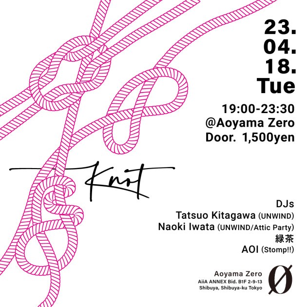 前回、スピンオフとして@Aoyama Zeroにて開催した渋谷White Space Lab でのTatsuo Kitagawa & Naoki Iwata 主催 ”UNWIND” のコンセプトであるモダン且つ心地良いディープハウスを軸により深く自由な表現を求めて、 ”UNWIND”〔ほどく〕から”Knot”〔結ぶ〕へと場所を移しての開催になります。