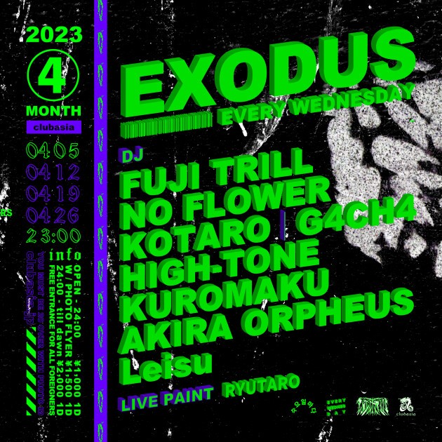 FUJI TRILLをはじめ多方面に活躍するDJ,BeatMakerが毎週水曜渋谷の夜をにぎわす通称" #エクソ "。LIVE TATTOO、PAINTも隔週でcheck。外国からのお客様は入場フリー!!是非お越しください!!