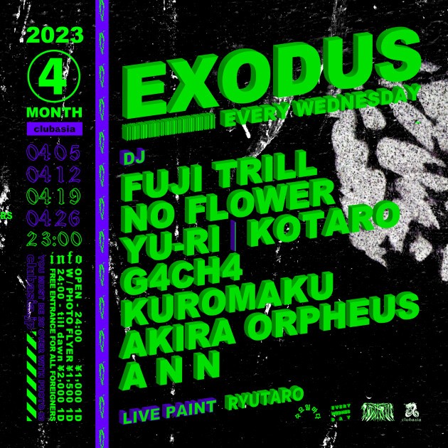 FUJI TRILLをはじめ多方面に活躍するDJ,BeatMakerが毎週水曜渋谷の夜をにぎわす通称" #エクソ "。LIVE TATTOO、PAINTも隔週でcheck。外国からのお客様は入場フリー!!是非お越しください!!