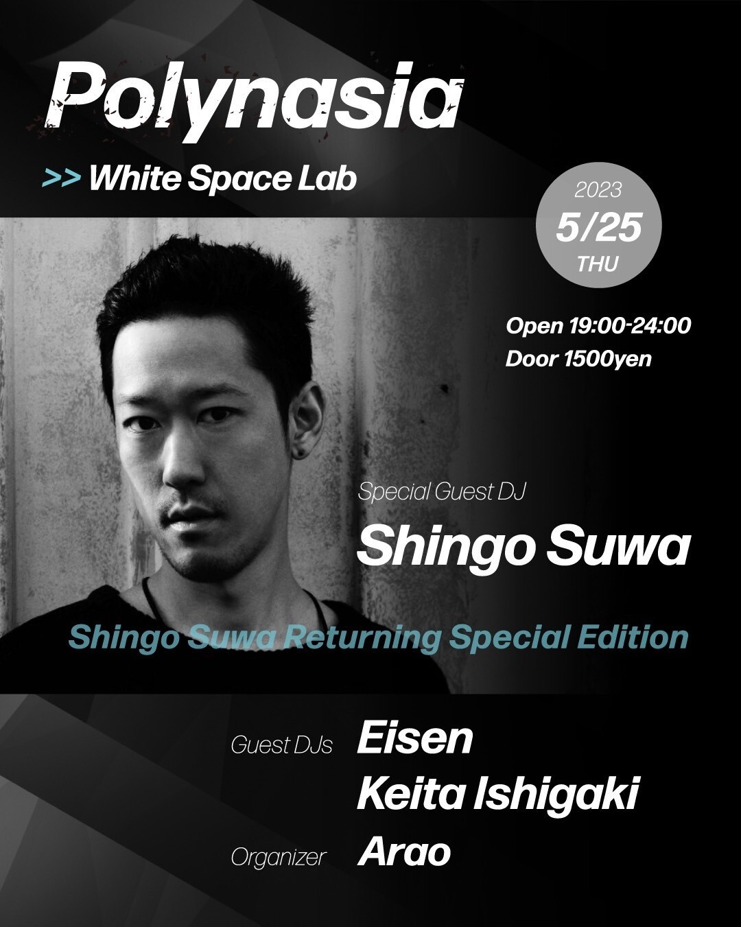 5月のPolynasiaは、ベルリン/ポーランドから数年振りに一時帰国する世界的著名なDJ/Track MakerのShingo Suwaを招致。日本に帰国後第1発目のDJとして、渋谷の音箱White Space Labにてロング・プレーを披露。都内のアンダー・グラウンドシーンでも実力のあるTechno DJ、EisenとKeita Ishigakiが脇を固める。