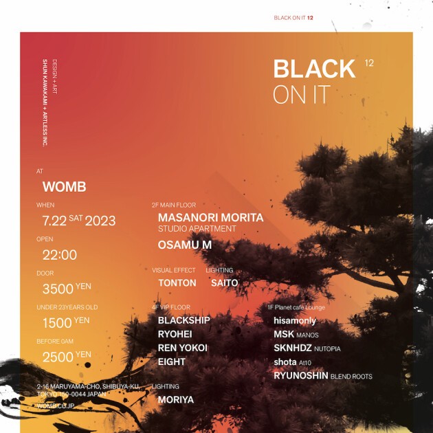 2F メインフロアには、STUDIO APARTMENT としてこれまでに9枚のアルバム、350曲以上の楽曲を世界各国のレーベルからリリースし、つい先日スペイン・マドリードの10万人規模のフェス A SUMMER STORY 2023 やイビサの Pacha、 イスラエルの HIVE といったクラブでの海外ギグから帰国した MASANORI MORITA と、WOMB を始めとする都内主要クラブを中心に、FUJI ROCK FESTIVAL や ULTRA JAPAN など様々なフェスに出演経験を持ち、今年5月に開催した新パーティー NEURON では Kandarta としての初出演でトップクラスのパフォーマンスを披露した OSAMU M の両レジデントが出演。VJ はもはや BLACK ON IT には欠かせない存在となった TONTON、LIGHTING は WOMB を知り尽くし TONTON との相性も抜群の SAITO が担当。音と光をシンクロさせて創り出す圧倒的な空間を是非体感していただきたい。