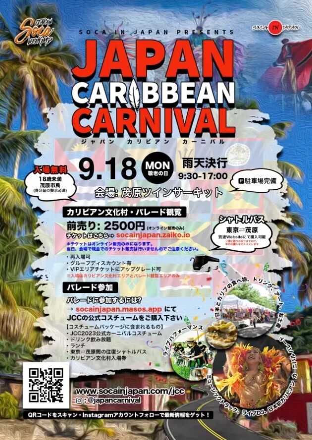 ジャパンカリビアンカーニバル(以下JCC)は、トリニダードアンドトバゴやマイアミ、世界各地で開催されている*ソカ ミュージックを使った カリビアンスタイルのカーニバルです。カリビアンスタイルのカーニバルは日本ではまだ前例がなく、2023年に初めて開催されます。