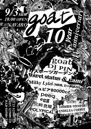 熊本公演ではメインアクトであるgoatの貴重なライブのほか、2013年の沖縄DMCチャンピオンにして即興〜電子音楽までリンクする唯一無二の実験的マッド沼宇宙ターンテーブリストDJ PIN、プチバズりしたSNSのアカウントが消失した現在も強い存在感を示し、いまだ誰も捉えきれてない謎の音楽性に中毒者も絶えない福岡のスポーツガーデンひ、Orange Milkをはじめ数多くの海外レーベルから音源をリリースし、元ドラマーという出自も活かした独自の躍動感や肉体性を感じられる山口のトラックメイカーtoiret statusにiPhone1台から驚きのサウンドを生み出す福岡のSSW・uamiが客演するなど、熊本を中心に近郊のアーティストも多数参加しパフォーマンスを行う。