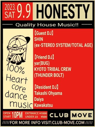 今回は京都のみならず関西の夜を牽引し続けているSHINをゲストに迎えお送りします!泣く子も踊る、唯一無二な彼のDJプレイスタイルに言葉は入りません。ただ拳を突き上げ叫ぶのみ。またCLUB MOVEにて開催している聴き応え抜群な平日Party「BUG」からyar、そして不定期開催ではあるがこの人達にしかできないPartyを毎回叩き出す「THUNDER BOLT」からKYOTO TRIBAL CREWが参加。