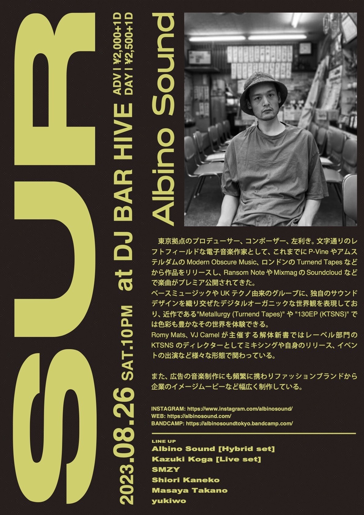 Albino Sound 東京拠点のプロデューサー、コンポーザー、左利き。文字通りのレフトフィールドな電子音楽作家として、これまでにP-VineやアムステルダムのModern Obscure Music、ロンドンのTurnend Tapesなどから作品をリリースし、Ransom NoteやMixmagのSoundcloudなどで楽曲がプレミア公開されてきた。 ベースミュージックやUKテクノ由来のグルーブに、独自のサウンドデザインを織り交ぜ たデジタルオーガニックな世界観を表現しており、近作である"Metallurgy(Turnend Tapes)"や"130EP(KTSNS)"では色彩も豊かなその世界を体験できる。 Romy Mats、VJ Camelが主催する解体新書ではレーベル部門のKTSNSのディレクターとしてミキシングや自身のリリース、イベントの出演など様々な形態で関わっている。 また、広告の音楽制作にも頻繁に携わりファッションブランドから企業のイメージムービーなど幅広く制作している。