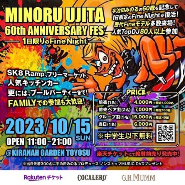 DJ、タレントの宇治田みのる(株式会社 F.FACTORY JAPAN(本社:東京都渋谷区)所属) は、還暦を記念したイベント”1 日限りの Fine Night -Minoru Ujita 60th Anniversary Fes-“を 10 月 15 日(日)に開催いたします