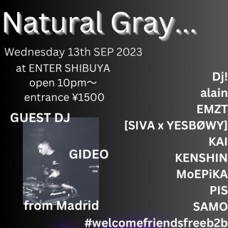 様々なヴェニューで活動しているプロデューサーやDJを招くnatural grey。前回に引き続きKENSHIN、UKファンキーなSAMO、幅広い選曲のMoEPiKA、KAI、PISが出演。さらに今回はスペインよりGIDEOを招聘。alain、EZMTも出演し、平日ながらもボリュームたっぷりのラインナップでお届けする。