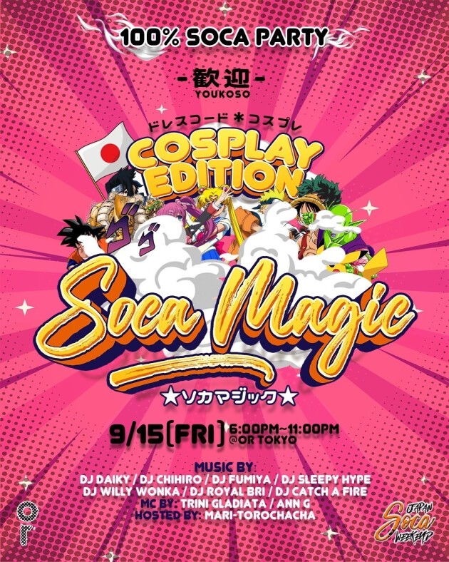Japan Soca Weekndのオープニングイベントは、渋谷で毎月開催されている100%SOCA MUSICイベントの「Soca Magic」がオープニングを飾ります。