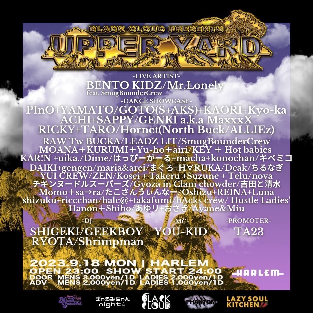 DANCE SHOWCASE: PInO+YAMATO, GOTO(S+AKS)+KAORI+Kyo-ka, ACHI+SAPPY, GENKI a.k.a MaxxxX, RICKY+TARO, Hornet(North Buck/ALLIEz), RAW Tw BUCKA, LEADZ LIT, SmugBounderCrew, KAR!N +uika., Dime, KEY + Hot babies , MOANA+KURUMI+Yu-ho+airi, Hustle Ladies’, はっぴーがーる+macha+konochan, maria&arei, ちるなぎ, Deak, DAIKI+gengen, まぐろ+H∀RUKA, AILI+Aika+uika+Maria, キベミコ, Hanon+Shiho, Ayane&Miu, 吉田と清水, あゆリ+おさき, halc@+takafumi, shizuku+riccchan, たこさんうぃんなー, Momo+sa→ra, nova, Oshizu+REINA+Luna, bAcks crew, Gyoza in Clam chowder, YUI CREW, チキンヌードルスーパーズ, ZEN, Kosei + Takeru +Suzune + Telu , UPPER YARD OPENING DANCERS(RENA+NAGISA+YUI+DAIKI+gengen+miko+miku+YUA)